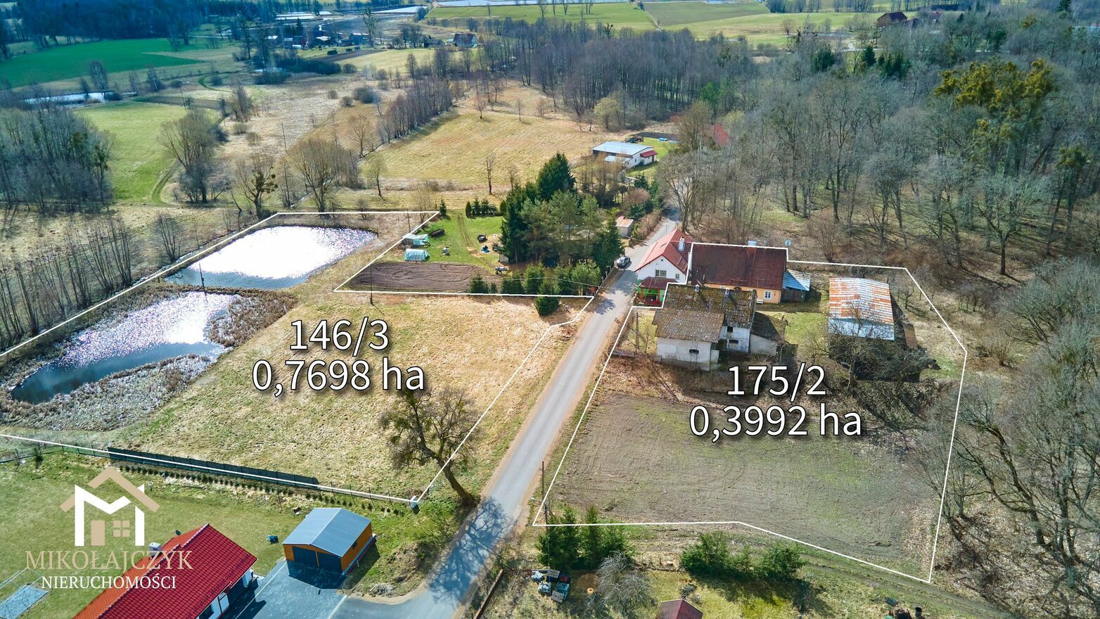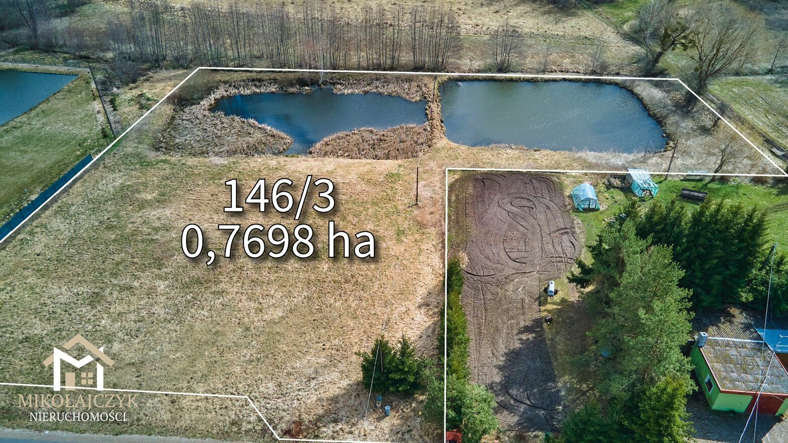 2) Działka o numerze 146/3 o powierzchni 0,7698 ha stanowi atrakcyjny teren rekreacyjny. Znajdują się na niej dwa stawy oraz łąka, co stwarza doskonałe warunki do wypoczynku lub zagospodarowania nieruchomości pod działalność rekreacyjną. Cena tej działki wynosi 29 000 zł.